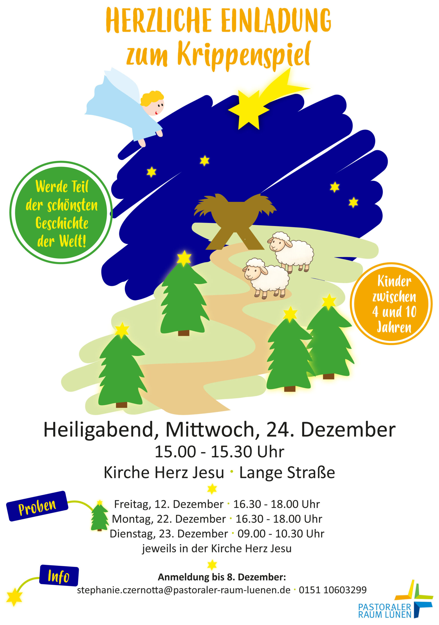 Für das Krippenspiel am Heiligabend  in Herz Jesu Lünen-Mitte, werden Kinder zwischen 4 bis 10 Jahren gesucht.
