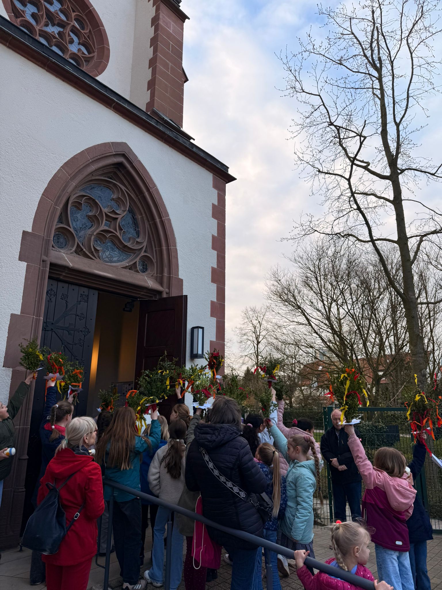 Zum Abschluss machten sich Eltern und Kinder gemeinsam auf den Weg zur Herz-Jesu-Kirche. Draußen unter freiem Himmel wurden die Palmsträuße gesegnet. Anschließend zogen die Kinder, begleitet von einer Sprechmotette, in die Kirche ein. Dort wurde eine kurze Geschichte vom Einzug und Leidensweg erzählt und die Osterkerzen als Hoffnungszeichen gesegnet.