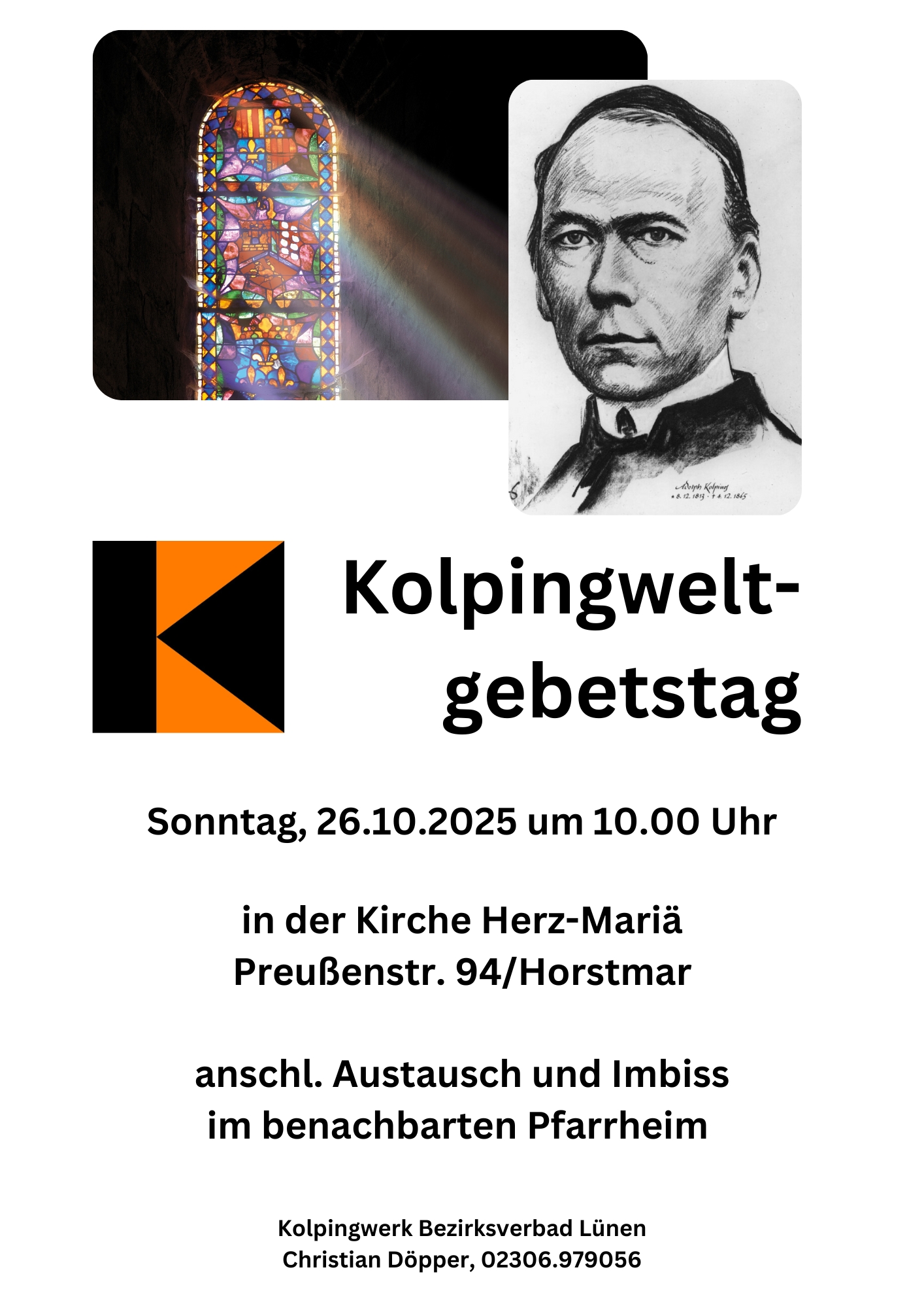 Am Sonntag, 26.10.2025, lädt die Kolpingsfamilie Lünen-Horstmar / Niederaden um 10.00 Uhr zur Feier der Heiligen Messe anlässlich des Kolpingweltgebetstages ein. Alle Kolpingsfamilien des Bezirks sind mit Bannerabordnungen herzlich willkommen.