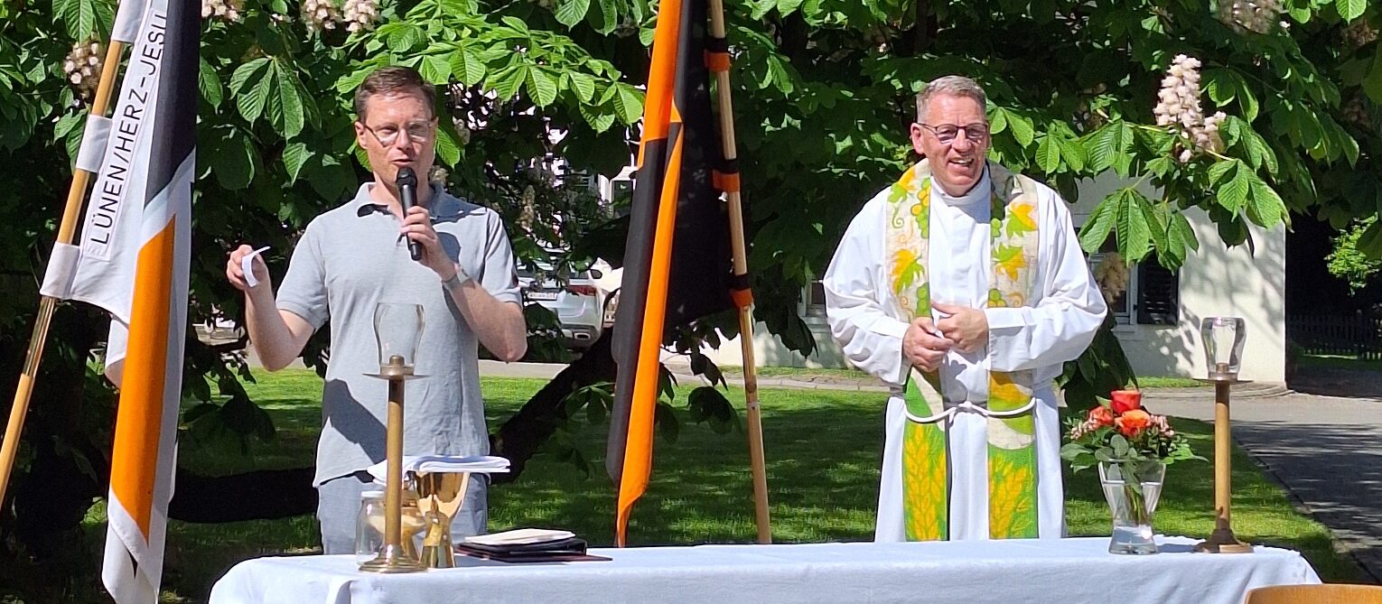 Angefangen hat der gelungene Tag mit einem Feldgottesdienst vor der großen Kastanie in der Mitte des Hofes. Pfarrer Dr. Thomas Roddey hatte sichtlich Freude daran, dass über 150 Gläubige das Angebot angenommen haben.
