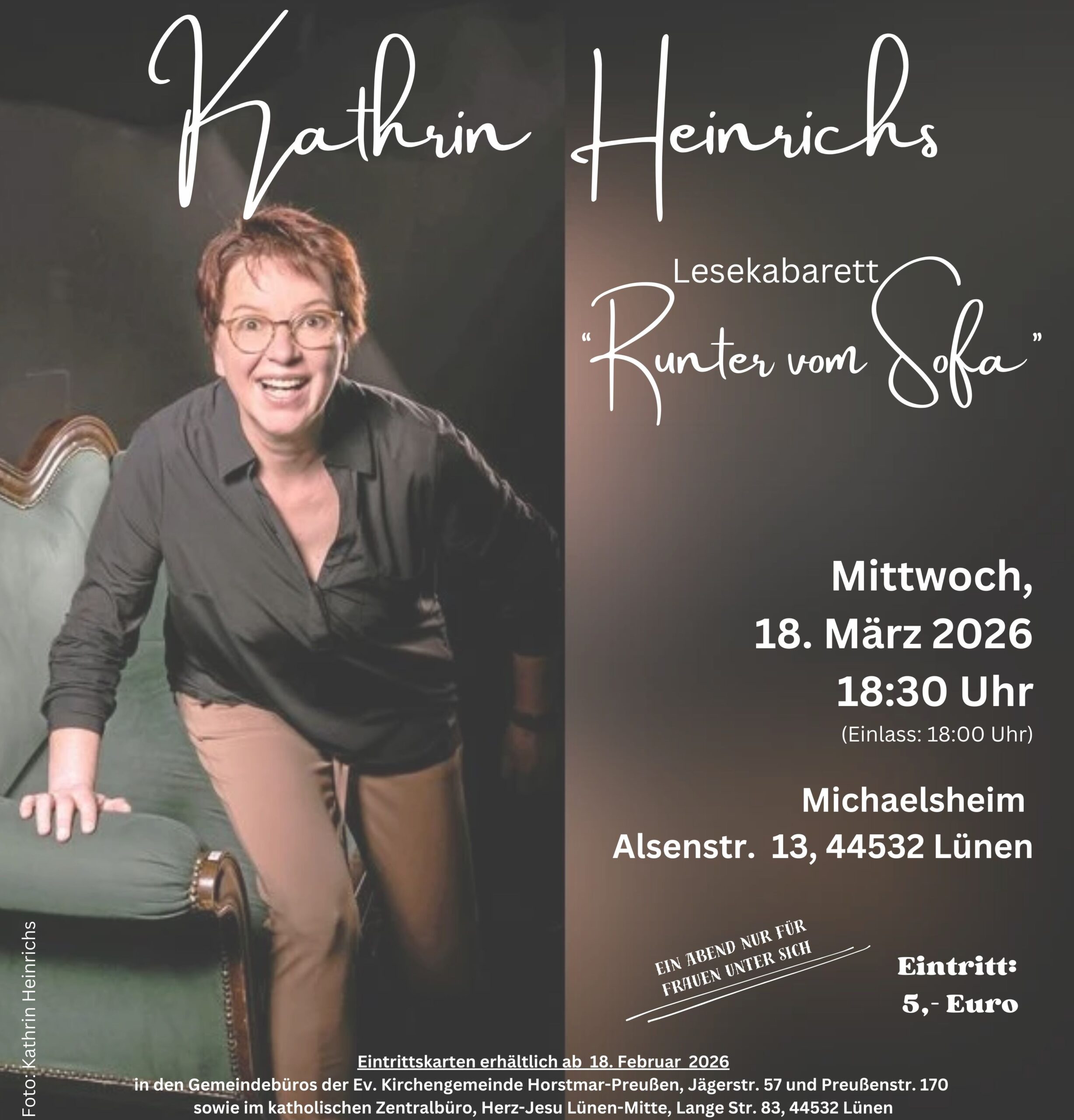 Beim Frauensalon im Lünen präsentiert die Autorin einen Streifzug durch ihre liebsten Texte und beweist: Selbst Krimis können zum Totlachen sein. Wer das Sofa am 18. März verlässt, kann sich auf einen Abend voller Humor und Esprit freuen, denn wie schrieb die Presse einmal über Kathrin Heinrichs? „Bei ihr werden aus banalen Alltagssituationen herrliche Geschichten – und aus einer ganz normalen Lesung ein Feuerwerk aus Wortwitz und Charme.“